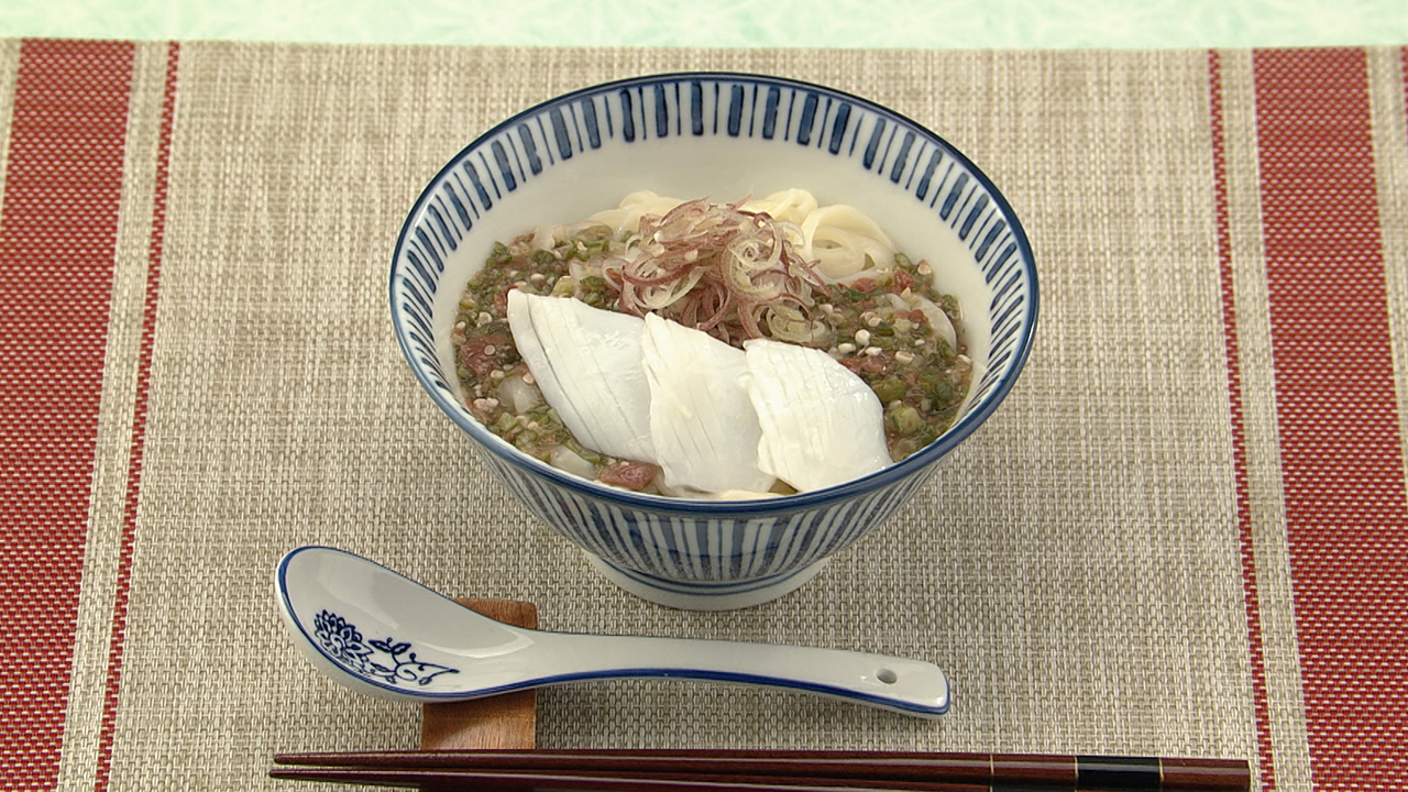 オクラのネバネバで、おだしがしっかりとうどんに絡みますね。梅干しもこんなふうに食べると塩味もマイルドで食べやすい!酸味もさわやかです。キリッと冷たくてツルツル食べられて、夏にぴったりのうどんですね。