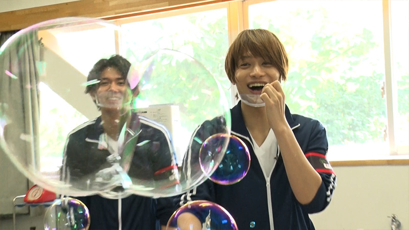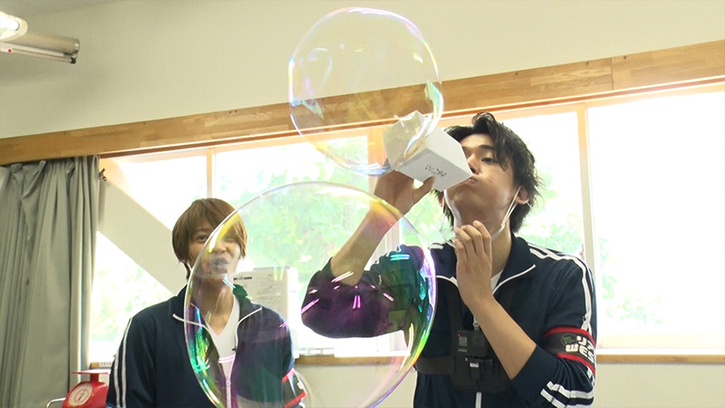 まずは基礎を理解するために、どんなものならシャボン玉が吹けるor吹けないを順番に当てていくことに。メガホンや洗濯ネットなどさまざまなモノが並ぶ中から、中間が一つ目に手に取ったのはビーチサンダル。見事にキレイなシャボンを吹き、満面の笑みを浮かべる中間の姿に「淳太かわいい~」と喜ぶ小瀧。リア突ではたびたびクレームを発し、不服そうな顔を見せることが多かった中間だけに、「なんか最近、淳太 殺伐としてたから」(重岡)とメンバーも嬉しそうだ。杉山ブラザーズは嵐や関ジャニ∞などのコンサート演出にも協力していると聞き、特に藤井が身を乗り出す。