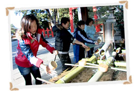 今回は竹田小学校の4年生達が案内役。まずは学校の創立(明治16年)以前からあるという校庭の大きなクスノキを囲んでパワーをもらい、出発。学校のすぐ近くを走る近鉄電車の線路の下をくぐると畑やお地蔵さんと出会う静かな住宅地。この辺りは京野菜の産地だという。続いて訪れたのは、みんなが七五三やお正月のお参りでよくお世話になっている城南宮。4人は参拝し、上達したいことをしっかりとお願いする。