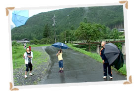 美山町の田歌に住む種人くん、然くん、葉ちゃんが案内役。緑とかやぶき屋根が印象的なこの村は雨でも風情がある。遠くに見える「青瀧の滝」は、ハート型に見える岩の真ん中を流れている事から面白い別名がつけられているという。続いては然くんと葉ちゃんの家で飼っているヤギ。可愛くて、じゃれあうのがとても楽しい。夜は八坂神社で京都府の無形民俗文化財に登録されている「田歌の神楽」のおはやしの稽古。伝統を受け継いでいるんだね!