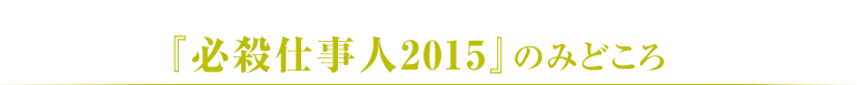 - 必殺仕事人が一年ぶりにまた帰ってきました。今回は新しい仕事人として遠藤憲一さんが、30年ぶりに出演してくださいます。そして、竹中直人さんが「女の敵」を演じてくれていますので、お二人の演技も楽しんでいただきたいと思います。 2015年の新しい必殺仕事人、ぜひごらんください。