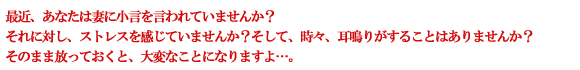 そんなある日、帰宅が深夜になり、妻からきつく当たられたH・Kさんは、突然キーンという耳鳴りに襲われました。幸い耳鳴りはすぐに治まりましたが、その後、様々な症状が出始めます。 |