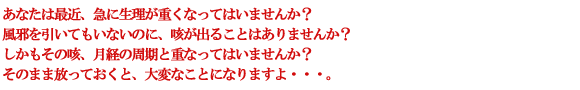 中堅商社で働くベテランOL、S・Mさんは、結婚して10年。これまで夫婦2人だけの時間を大事にしたいと考えてきましたが、そろそろママになりたいと考え、子作りに励むことに。しかし、半年経ってもなかなか妊娠の兆しはなく、なぜか乾いた咳が出るようになります。そして、もともと生理が重く、10代の頃から生理痛に悩まされてきたS・Mさんは、やがて乾いた咳が生理と全く同じ周期で起きていることに気付きますが、その後も異変は続きました。