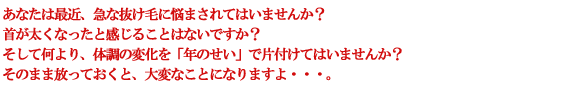 「バセドウ病」とは、詳しい原因はわかっていませんが、首にある甲状腺という臓器に異常が生じ、新陳代謝を高める甲状腺ホルモンが過剰に分泌。全身に様々な障害を引き起こす病です。バセドウ病は、男性よりも圧倒的に女性に多いといわれる病。20代から40代を中心に、成人女性の300人に1人は患っているといわれます。最初にS・Kさんを襲ったあの「抜け毛」は、何らかの原因で甲状腺の免疫システムに異常が発生し、甲状腺の中の細胞を異物と間違え攻撃したため、ホルモンが過剰に分泌。猛烈な勢いで新陳代謝が行なわれた結果、髪の毛は成長するよりも早く、次々に抜け落ちていってしまったと考えられます。また「イライラ」「動悸」「発汗」などの異変も、この「抜け毛」同様、ホルモンの過剰分泌が引き起こしたもの。しかし厄介なことに、これらの症状は、加齢や更年期障害によるものとなかなか見分けがつきません。では、彼女がこの病に気付くチャンスはなかったのでしょうか?実はその最大のポイントこそ、「首が太くなる」という異変。これは甲状腺が、大量のホルモンを分泌し、腫れあがったもの。これこそがバセドウ病最大のサインなのです。ところが、S・Kさんはそれを肥満のせいと勘違いし、早期発見のチャンスを逃してしまいます。そして、甲状腺で起きていた免疫異常が、今度は毛根でも発生。ついに円形脱毛症を併発してしまったのです。その後、S・Kさんは、バセドウ病と円形脱毛症の治療を根気よく続けた結果、1年後には病のコントロールに成功。以前と同じ様な生活を送れるようになりました。