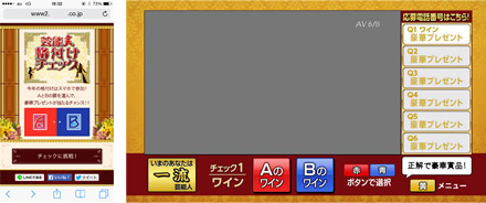あなたもお年玉獲得を目指して格付けチェックに挑戦しよう!チェックは全部で6問。番組の進行に合わせてデータ放送、スマホから参加いただけます。各チェックは番組と同じ2択形式です。締切時間までに、赤(A)または青(B)のボタンを押して回答して下さい。1問回答するたびに、正解すれば豪華賞品を、また不正解でも残念賞を、5名様にプレゼントします。回答後に表示される電話番号に電話をして応募してください。