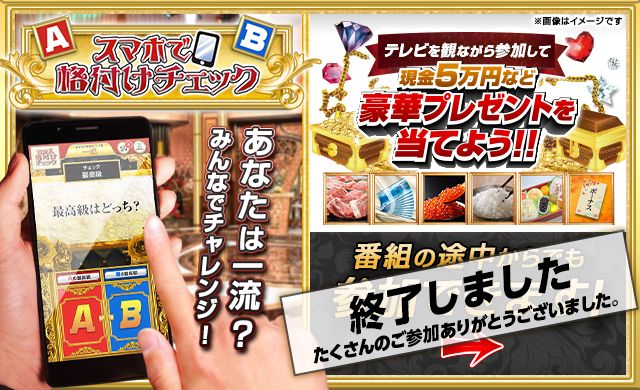 一流芸能人たちがチームを組んでさまざまなチェックに挑み、間違えるごとに一流→普通→二流→三流→そっくりさん、そして最後には“映す価値なし(画面から消滅)”とランクがどんどんダウンしてゆく、元祖格付けバラエティーの決定版!今回は「芸能人格付けチェック 食と芸術の秋3時間スペシャル」と題し、日本を代表する一流芸能人たちがプライドとメンツをかけ、“食と芸術”にまつわる6つのチェックに挑戦する!!