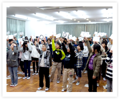 続いて「朝日放送〇×クイズ」、手作りの○×用紙を使って、クラス対抗で盛り上がります。