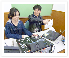 今回から、これまでの「アナウンサー&フロアディレクター&カメラマン体験」に加えて「スイッチャー体験」を新たに実施してみました。カメラの映像(スタジオのアナウンサー)とVTRの映像(ニュース映像)をコメントに合わせて、ボタンを押して切り替えます。
