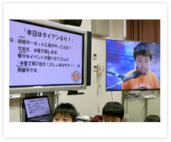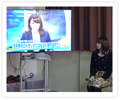 「出前授業当日、私はお昼のTVニュースを担当したので、歌島小学校5年生のみんなには、実際に私が読んだニュースの映像を見てもらいました。たまたま節分の日で、豆まきにちなんだニュースもあり、「本当にさっきニュースに出ていたんだ!」と思ってもらえたようです。さらに、ニュースの準備から本番の様子を撮影してもらっていたので、併せて上映しました。私のバタバタと下読みする姿を真剣な眼差しで見つめる子供達、如何にたくさんの人が放送に携わり、しっかり準備をしているのかも知ってもらえたのではないでしょうか。