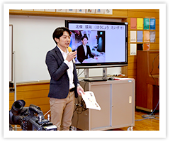 アナウンサーの一日の流れや苦労話、必要とされる技能、心構えを教えて欲しいとのリクエストを受け、阪神タイガースキャンプの取材から戻ってきたばかりの北條瑛祐アナウンサーが講師を担当しました。