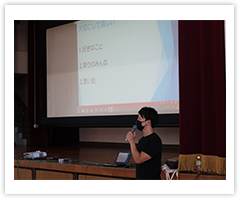 最後に明日からの「トライやる・ウィーク」に向けて、私たちから生徒の皆さんへ「ありがとうとごめんなさい」「とにかく楽しむ」「ほう・れん・そう(報告・連絡・相談)」「あいさつ」の4つの心得をアドバイス。