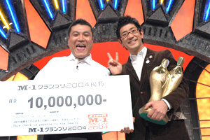 賞金1000万円の使い道については「見た事のないお金ですからねえ。事務所と相談ですね。なんだかM−1が始まる直前に事務所の改装工事が始まって、少し事務所に持って行かれるでしょう」と二人とも声を揃えた。