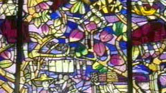 館内のステンドグラス「楽園」は、福井地方裁判所のホールを飾っている高さ7m、幅3mの大ステンドグラスの3分の1のミニチュア複製版。楽器を奏でる人たちの様子が理想郷さながらに描かれている。ほかに「兎春野に遊ぶ」やパリの地下鉄車内の様子を描いた「メトロ」などの代表作が展示されている。 |