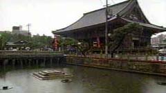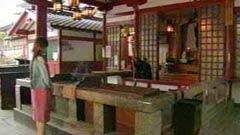 四天王寺の亀井堂は、堂の中心に大きな亀甲の石の水盤があり、亀の口から霊水が水盤に流れ出ている。参拝者は経木(きょうぎ)に亡くなった人の戒名を書き、回向してもらった後に亀井堂の水盤の水に入れて追善供養する。経木が水に浮くと極楽往生したことになり「これでご先祖も浮かばれた」と安心する。 |