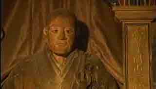 秀吉像の厨子の扉の表にはススキに桐の紋、裏面には菊と紅葉(もみじ)と桐紋の図が描かれている。宿してた露が今にもこぼれ落ちそうなススキの風情が、秀吉の辞世の歌「つゆとおち つゆときえにし わがみかな なにわのことも ゆめのまたゆめ」の心情を映し出しているようだ。北政所の厨子の扉には表裏とも松に篠竹の図が描かれ、その美しさには目を奪われる。 |