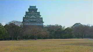 大阪城内の西の丸庭園(有料)は昭和40年(1965)に開園した芝生庭園で、本丸の石垣、その上にそびえる天守閣が最も美しく、堂々とした姿が望める絶好のポイントである。この庭園は徳川時代の西の丸跡地やその南側の城代屋敷跡などをまてめて庭園にしたもので、総面積は6万4000平方m(約2万坪)、周囲を樹木に囲まれた静かな庭で、春は桜の名所として知られている。 |
