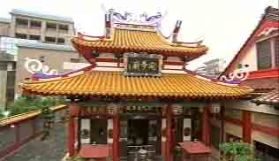 慶応3年(1867)の開港と共に多くの華僑の人たちが神戸に進出してきた。華僑の人たちの心のよりどころとなっている関帝廟の本堂には、主神の関帝像のほかに聖観世音菩薩像、媽祖(まそ)とも呼ばれる女神・天后聖母像が祀られている。本堂屋根には宝玉をつかんでにらみ合っている青龍が飾られ、赤い角が突き出た山門、登龍門とも言われている中門など、境内には中国情緒があふれている。 |