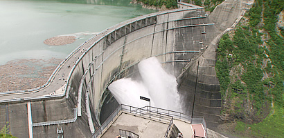 日本を代表するダムの1つであり、富山県東部の黒部川上流に建設されたアーチ式コンクリートダム。ダムの高さ(堤高)は186mで日本一を誇る。立山連峰を望み、ダム湖を遊覧船でまわる事もできる。夏から秋にかけて行われる放水は圧巻の美しさ。