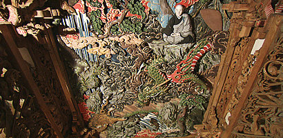 幕末に活躍した、大酒呑みで知られる彫刻家「石川雲蝶」が、6年の歳月をかけ完成させたといわれる、美しい天井彫刻を見ることができる。