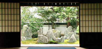 大胆な石組みと苔が美しい庭を堪能できる。見学は、すべて予約制。