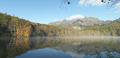 戸隠の山々を美しく水面に映す、紅葉のポイント。戸隠神社奥社につながる散策路がある。