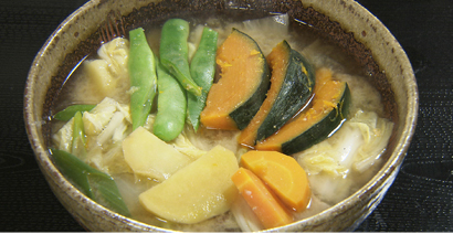 シンク明野農園の直売所にある食事処。自慢のほうとうは、注文を受けてから全粒粉を使った手打ち麺と、自家農園の野菜や県内産野菜を自家製の味噌で煮込む一品。山梨県の地酒も充実している。