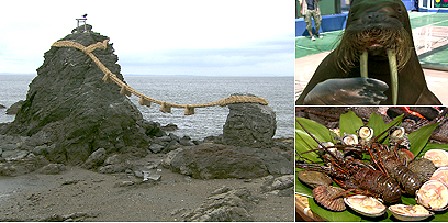 縁結び・夫婦円満・交通安全の御利益があり、沖合にある注連縄でつながれた夫婦岩は鳥居の役割をしている。