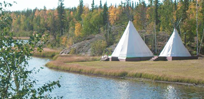 イエローナイフはオーロラが見えることで世界的にも有名な場所。特にオーロラがよく見える場所にあるのがオーロラビレッジ。伝統的な先住民の住居、ティピというテントの中で、オーロラが出るまでの時間を快適に過ごせる。秋は、キャメロンフォールズへのハイキングや野生のバッファローを見るツアーが人気。