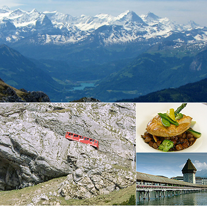 ピラトゥスの登山列車は、世界一の急勾配を誇り、岩壁すれすれを走るためスリル満点。山頂では、ルツェルンの街並みやアイガーなどのアルプスの山々を望むことができる。
