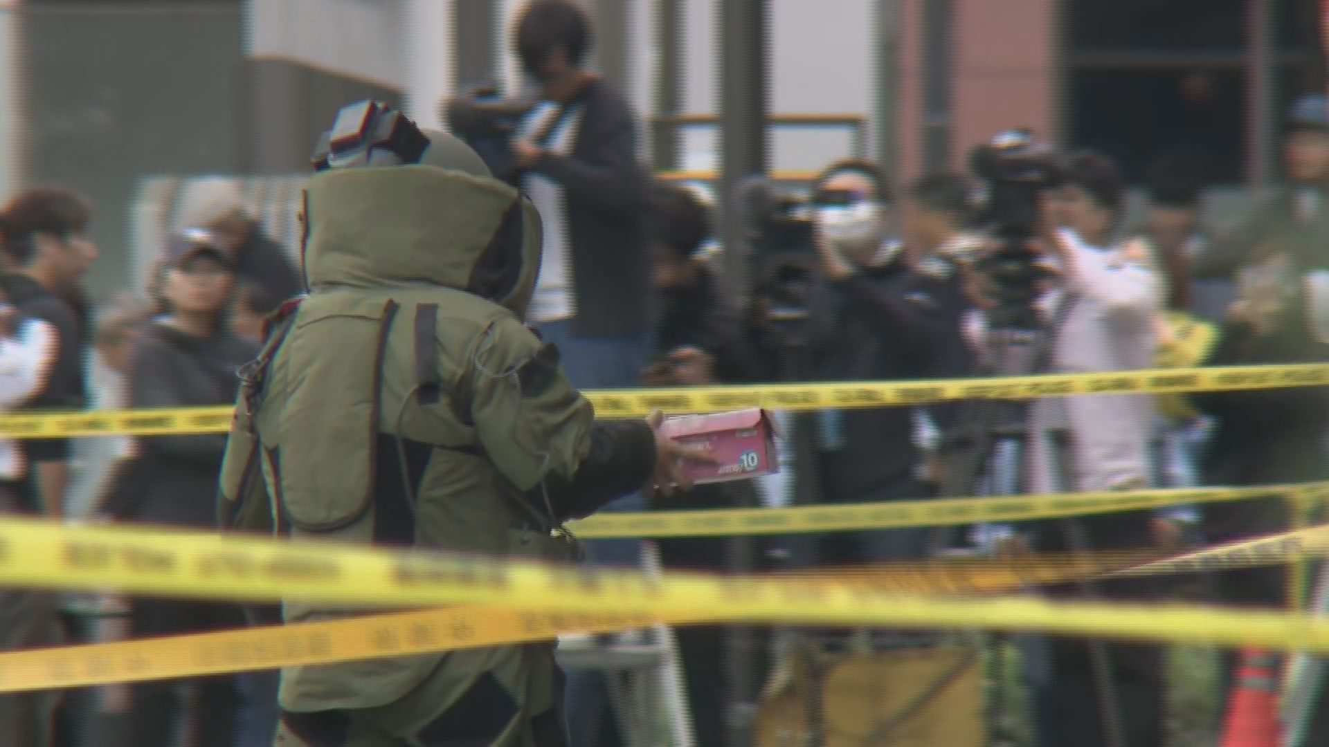 警察が車内を調べると、後方の座席の下に縦20cm×横30cm×幅15cmの紙製の箱が見つかったため、爆発物の可能性もあるとしてただちに周辺一帯を規制しました。