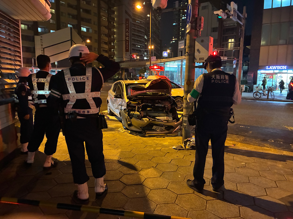 17日夜、大阪市中央区の松屋町筋で乗用車が電柱に激突する事故がありました。