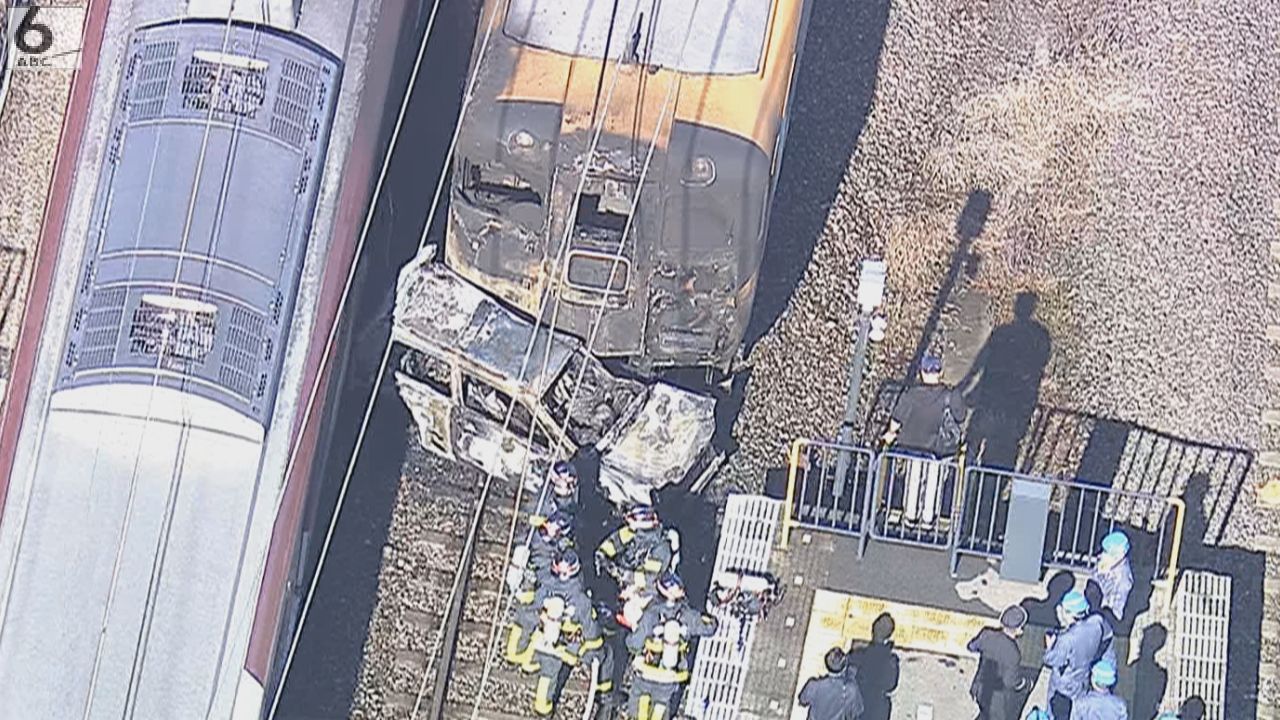 映像によりますと、車は特急に押し出されるようにして駅のホームの端で停止し、大破・炎上しました。特急電車の運転席部分も焼けました。