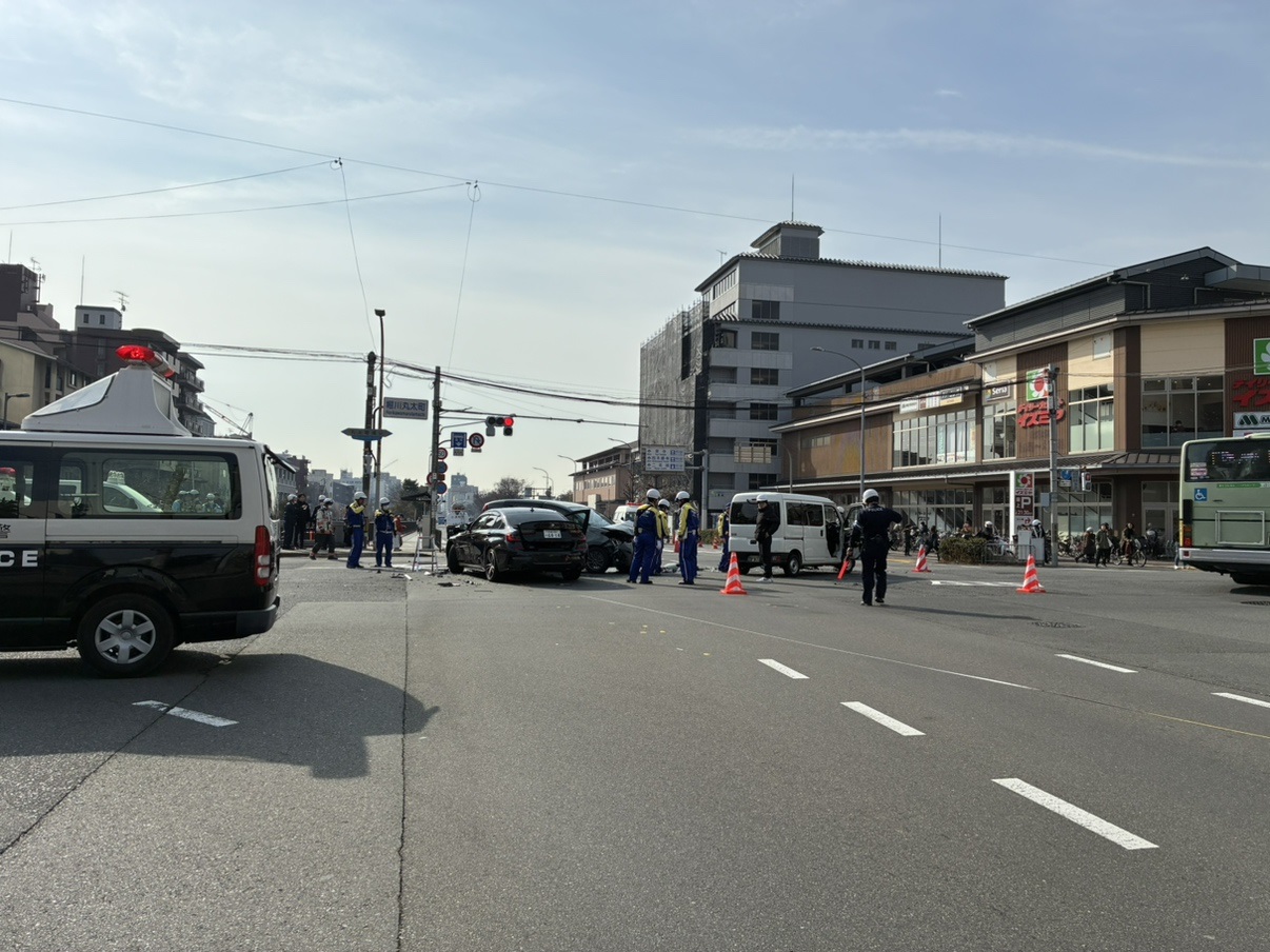 5日午前9時ごろ、上京区の堀川丸太町交差点で「車3台と歩行者の関係する事故。男性1人が車の下敷きになっている」と119番通報がありました。