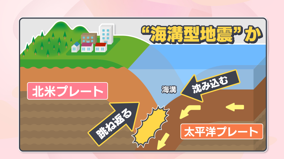 横田教授は、今回の地震は去年12月に起こった地震と同じ「海溝型」の地震とみています。「海溝型地震」とは、海側の太平洋プレートが陸側の北米プレートの下に沈み込もうとする境界面で、引きずり込まれた北米プレートが跳ね返ることによって起こります。