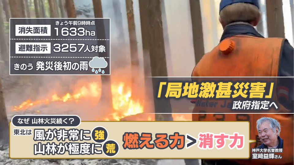 では、なぜ岩手県大槌町の山林火災は続いているのでしょうか。室﨑名誉教授は、気象条件の変化や山林が極度に荒れていることから、「“燃える力”が“消す力”を上回ってしまっている」と指摘します。