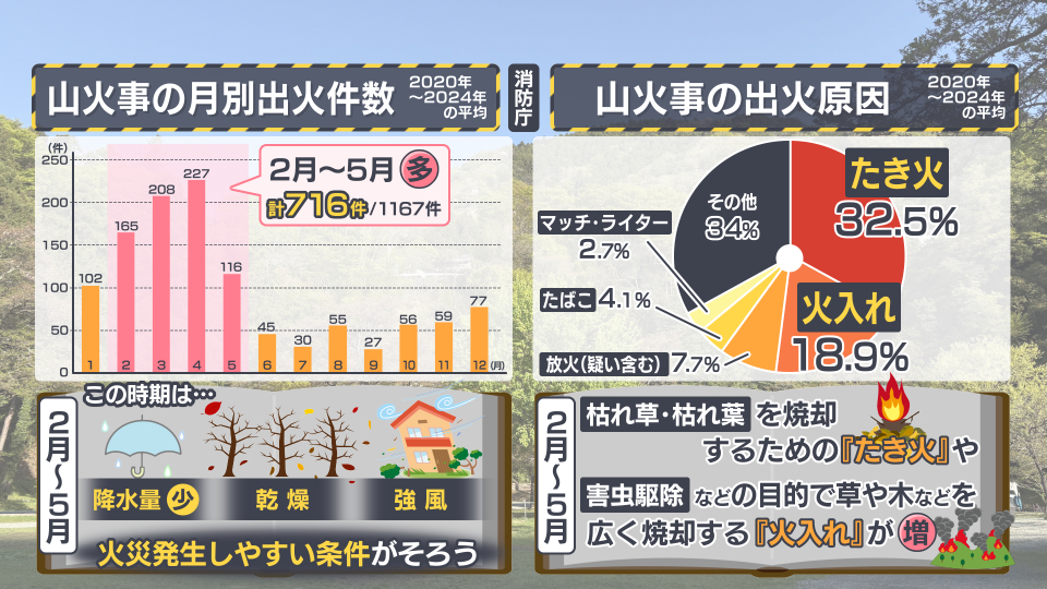 山火事の月別出火件数を見ると、2020年~2024年の平均で2月から5月にかけて多いことがわかります。この時期は降水量が少なく乾燥、さらには強風も重なり火災が発生しやすい条件がそろっています。