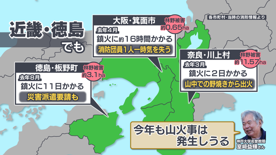さらに去年8月、徳島・板野町の山火事では鎮火に11日かかり、災害派遣要請もありました。室﨑名誉教授は「今年も山火事は発生しうる」と注意を呼びかけています。