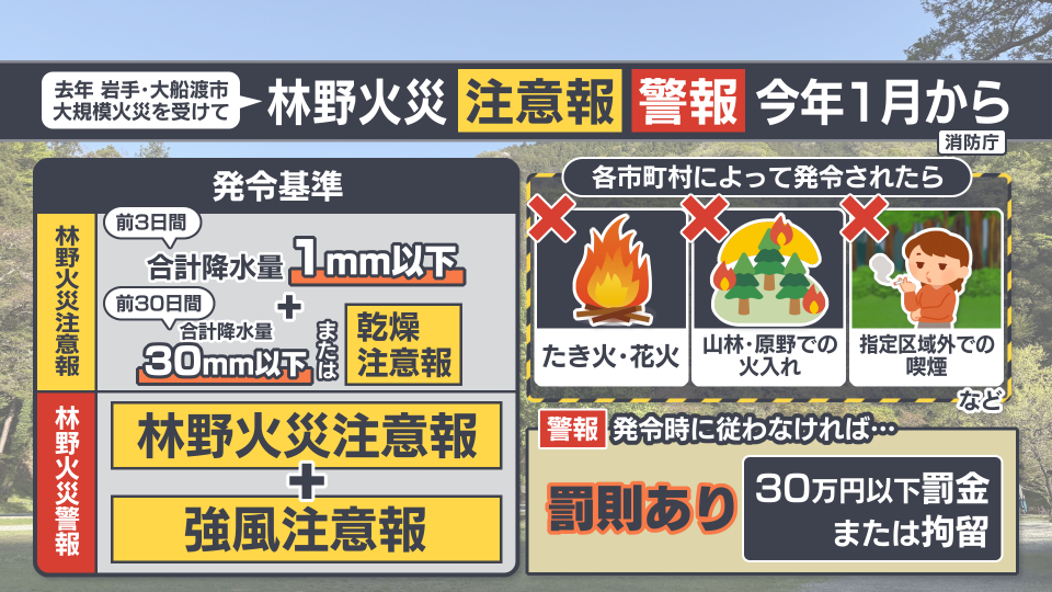 去年、岩手・大船渡で大規模な山火事があり、今年1月から「林野火災注意報・警報」の運用が始まっています。