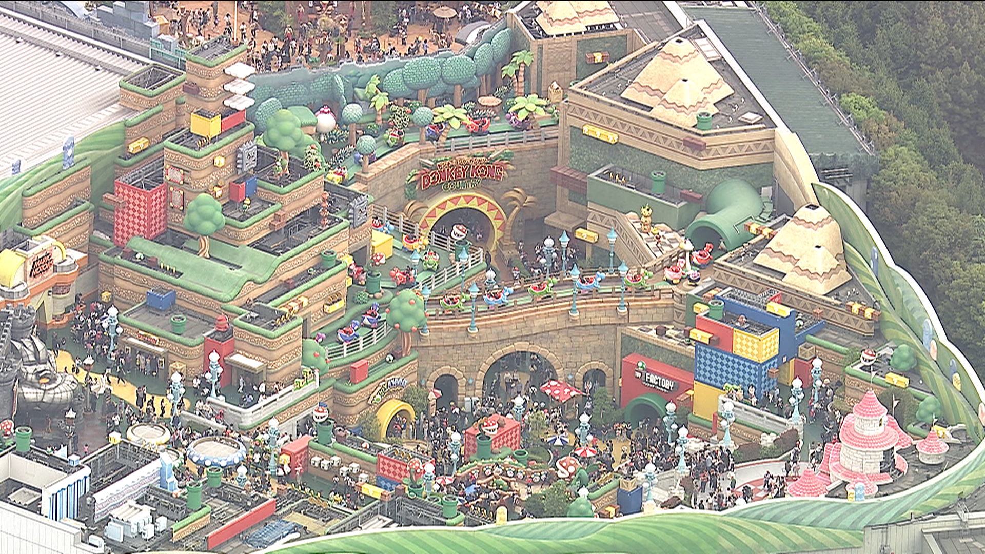 空から眺めると、今年5周年を迎えたニンテンドーエリアには多くの人が詰めかけていました。関西が誇るテーマパークは、さすがの人気ぶりでした。