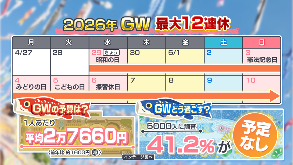 民間の調査によりますと、ことしのGWの1人あたりの予算は2万7660円。前年と比べて約1600円減りました。「予定なし」と回答した人は41.2%を占めました。