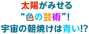 太陽は何色か知ってますか?空の色はなぜ青いかしっていますか?太陽の光が織りなす地球の色。色の元となる「光」について実験をしながら学んでいきます。なぜ朝日や夕日が赤いのか?そして、宇宙からみた「青い朝焼け」とは?