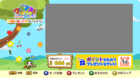 うえから落ちてくるアイテムをリモコンの左右キーで移動してキャッチするゲームです。毛虫をよけながらアイテムをゲットしてください。